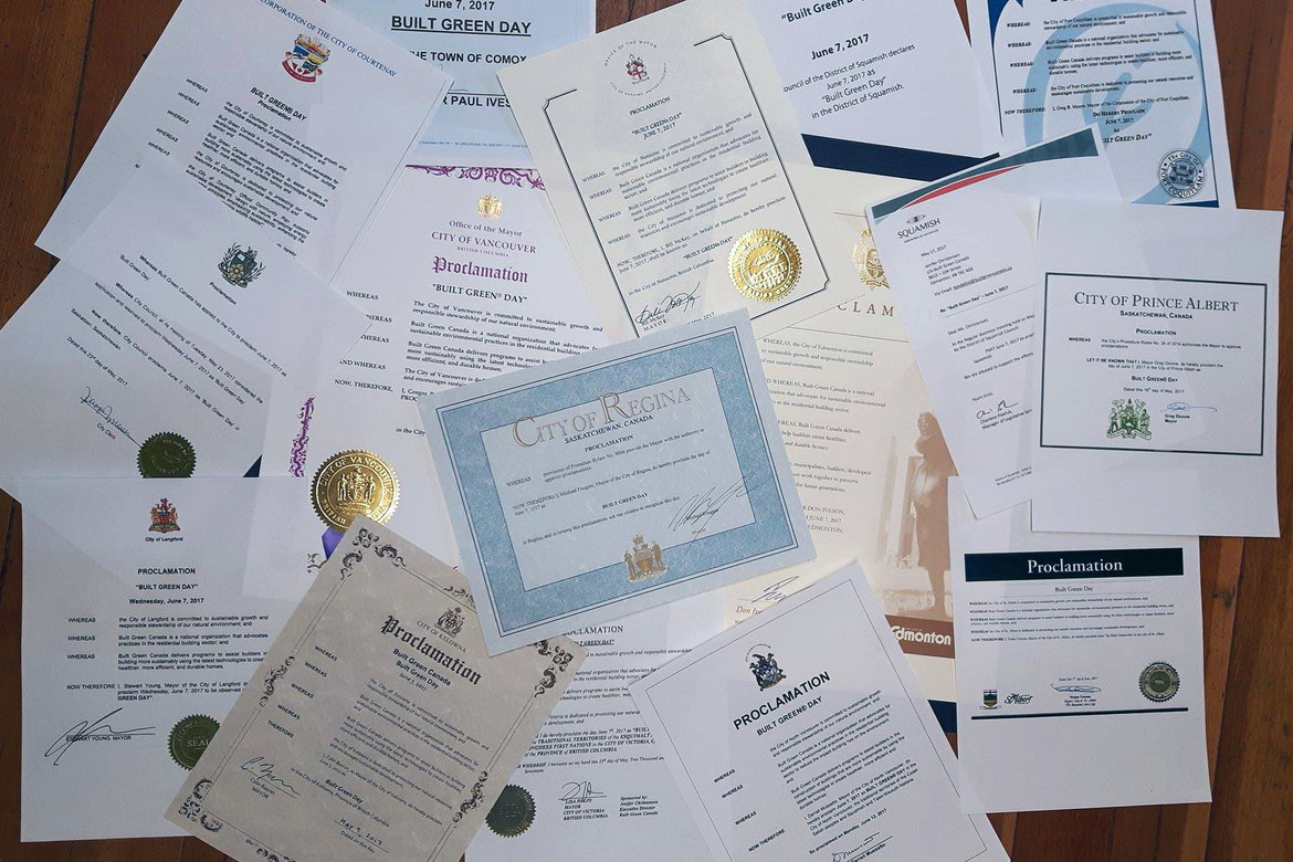 June 7, 2017—Concurrent with National Environment Week, Built Green Canada issued its fourth annual challenge to municipalities across the country to encourage sustainable building policies. The challenge is marked by a growing number of municipalities who have proclaimed June 7 as BUILT GREEN® Day. This includes: Campbell River, Comox, Courtenay, Edmonton, Fort Saskatchewan, Kelowna, Moose Jaw, Nanaimo, North Vancouver, Penticton, Port Coquitlam, Prince Albert, Regina, Saanich, Saskatoon, Strathcona County, St. Albert, Squamish, Surrey, Vancouver, Victoria. Chestermere and Yorkton acknowledged BUILT GREEN® Day, Collingwood has proclaimed the day Built Green Canada Day, Okotoks is in support of BUILT GREEN® Day, Lethbridge will mark the day by lighting up City Hall through green LEDs on June 9 and June 10, while others are endorsing third-party certified programs, including Built Green’s.