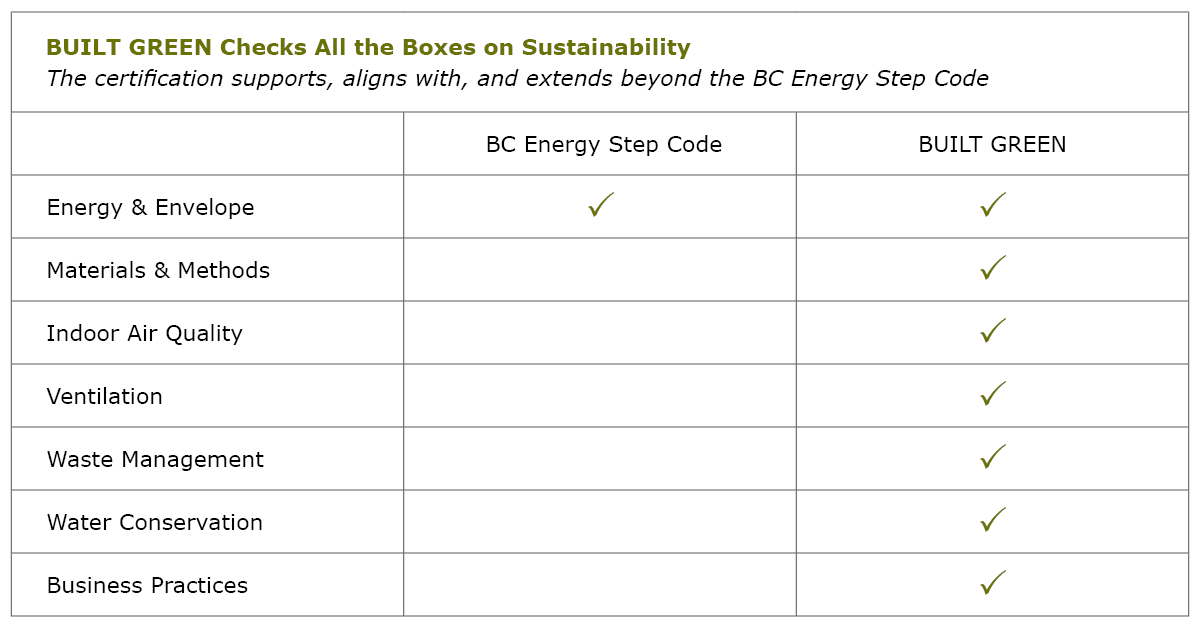 But BUILT GREEN doesn’t just align with Step Code, it picks up where code leaves off. While regulation is driving increased energy performance, that's just one part of the sustainability story.